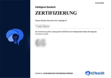 „Ich fand es toll, wie einfach das Verfahren war. Der Test hat Spaß gemacht, die Ergebnisse waren schnell da, und das Zertifikat sieht toll aus! Ich bin mit meinem IQ-Ergebnis und der Benutzerfreundlichkeit der Plattform sehr zufrieden.“